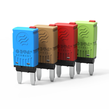 Typ 1620 von E-T-A: Einpoliger, thermischer Sicherungsautomat in Mini-Bauform, der speziell für den Kfz-Bereich geeignet ist.